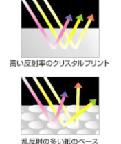 左の図は、通常の光沢プリントとクリスタルプリントのイメージ図です。通常の光沢プリントは、ペーパーに凹凸があるため、光の反射がまばらになります。 平滑性の高いクリスタルプリントペーパーは、光がすべて一定方向に反射するので、鏡に映ったような光沢を実現。