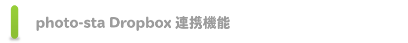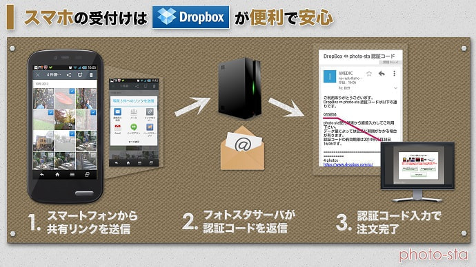 フォトスタでは、『Dropbox』の共有機能を使ってインターネットに自動保存されたデータを直接読み込むため、スマートフォン本体を受付端末に接続する必要はありません。『DropBox』のカメラアップロード機能(端末で撮影された画像データを自動的にDropboxにアップロードする機能)によって保存されたデータから、お好きな写真や動画を選んで、簡単にプリントや保存の注文ができます。