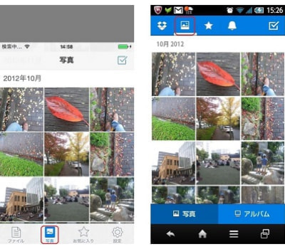 スマートフォンでDropboxを起動し、iPhoneの場合は下部ツールバー、Androidの場合は上部ツールバーにある、「写真」アイコンをタップして写真タブを表示します。