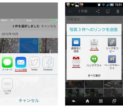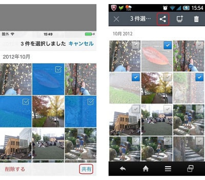 画面右上の「✔」マークアイコンをタップして、注文したい写真を選択し、iPhoneの場合は右下の「共有」、Androidの場合は上部ツールバー中央の「共有」アイコンをタップします。
