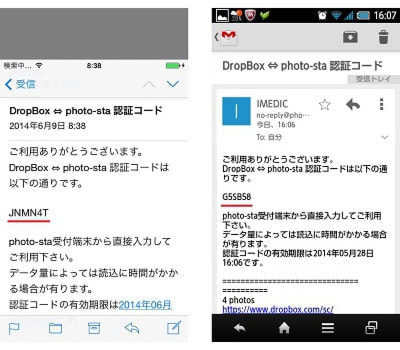 しばらくすると、送信元アドレスに6桁のフォトスタ専用認証コードが記載された、左の様なメールが返信されます。